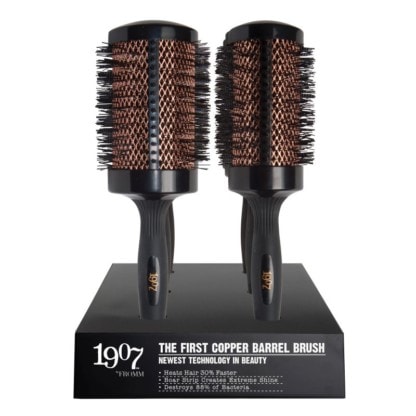 Unique copper barrel brush. Why copper? Premium thermal properties provide superior temperature control to evenly heat hair 4x faster than a standard plastic vented brush. Featuring a handcrafted 100% boar bristle strip and waved nylon bristles that provide extra grip for shiny, beautiful hair.