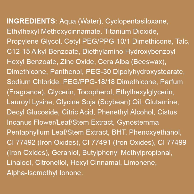 Functioning as a multi-all-rounder, DD cream reduces the size of wrinkles and blemishes. Anti-aging ingredients prevent skin aging and protect against sun rays with SPF 15. Perfect to disguise wrinkles. Available in the lighter nuance “Natural 01“ & the darker nuance “Sand 02“.