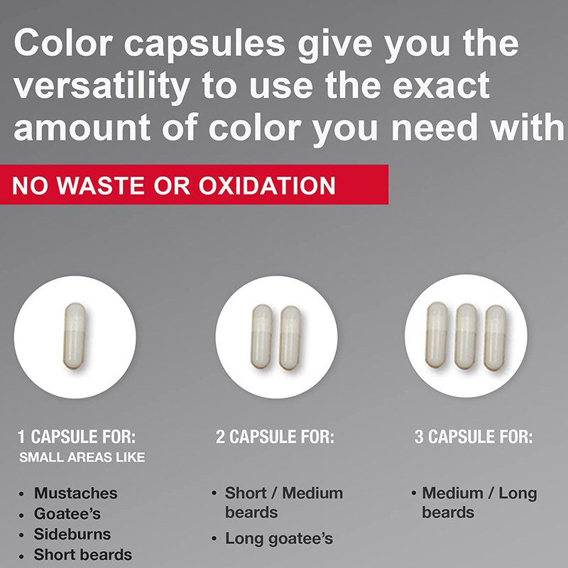 Ideal for colouring men’s facial hair, especially small areas like short beards, moustaches, goatees and side burns. Pre-measured colour capsules give you the versatility to use the exact amount of colour with no waste. The unique colour capsule is formulated with microscopic colour pigments that deeply penetrate coarse facial hair, delivering long-lasting colour for up to 6 weeks.