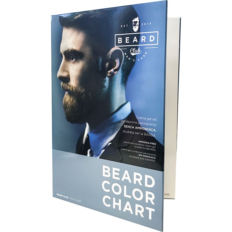 Specialist chart for the Beard Color Gel to highlight the different shades and the end color results for each on certain hair types. Also features instructions with the Beard Color Activator, guidance images and the benefits of the color and brand.