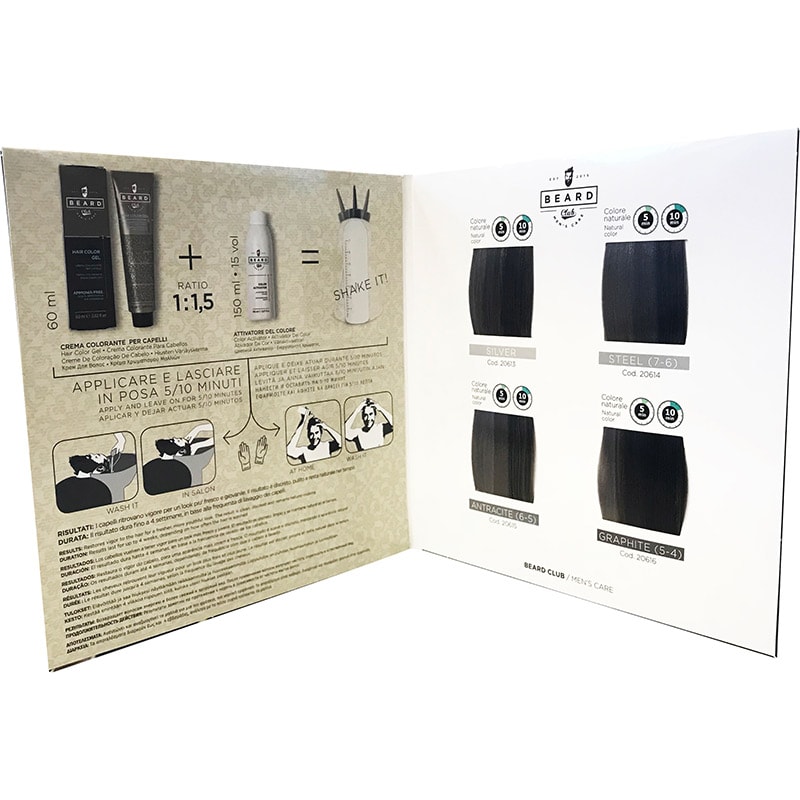 Specialist chart for the Hair Color Gel to highlight the different shades and the end color results for each on certain hair types. Also features instructions with the Hair Color Activator, guidance images and the benefits of the color and brand.