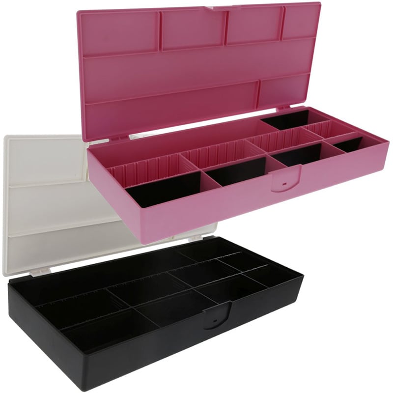 Size: 33cm x 14.5cm x 4.5cm. Flat and compact design makes this cosmetic box perfect for easy storage and access. Features a number of compartments sizes and shapes to house nail and beauty products, tools and implements and keep them safe and secure during travel.