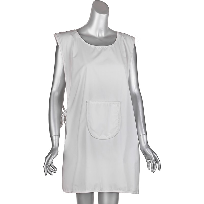 Water-repellent polyester and cotton pinafore. Side ties, white, large size. Provides protection and coverage during spa treatments. Comfortable and lightweight polyester and cotton blend provides protection for midsection. Features pocket in front.