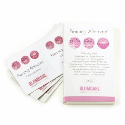 Blomdahl Piercing Aftercare Swabs (24). Cleans and sanitises the piercing hole. Aids in recovery. Minimizes recovery time so earrings can be worn as quickly as possible.