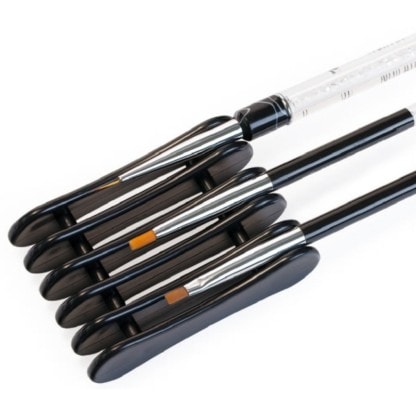 A convenient storage spot for nail brushes. Allows brushes to dry and retain their bristle shape and integrity when not in use. Ideal for extending the lifespan of make-up brushes by limiting chances of damage.