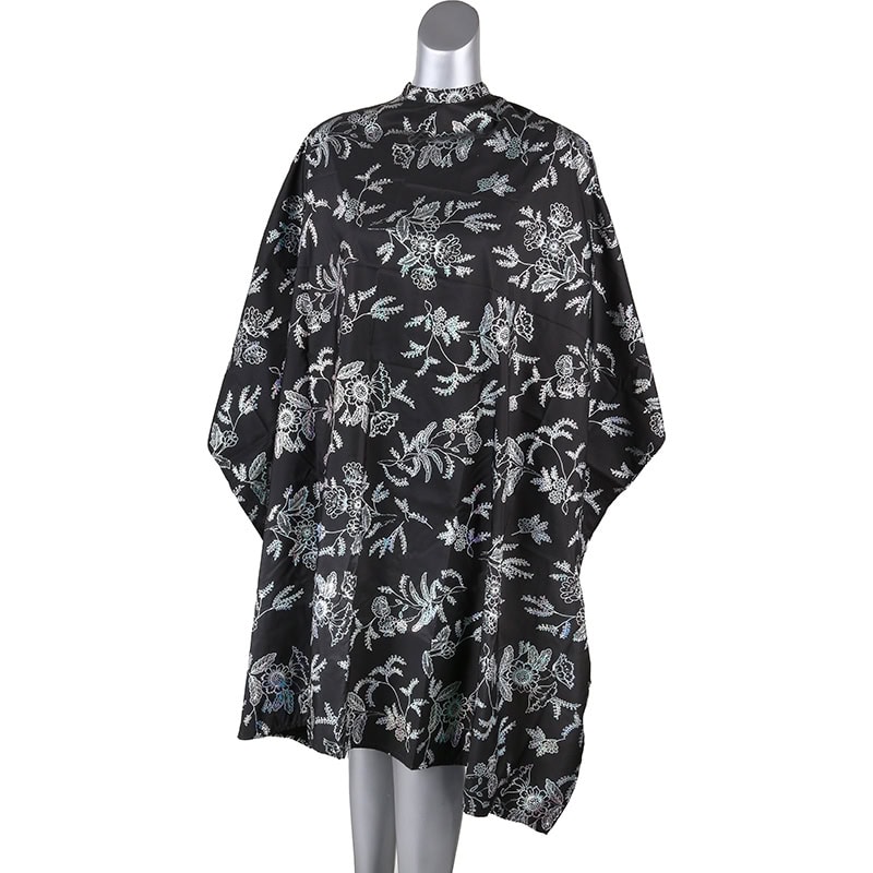 Black cape with a twist. Floral patterns have a metallic, iridescent finish that reflects in different colours depending on the lighting. Comfortable material for easy wear.