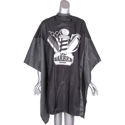 Classic barber shop motif design with large coverage for added protection. Black and white design with pinstripe side panels for added flair. Stud closure and lightweight polyester material that is easy to clean and is durable. Ideal for any trendy barber shop.