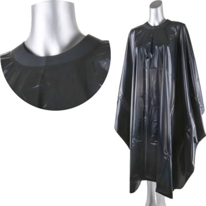 Polyester and polyurethane material blend makes for a cape with maximum protection against water and chemicals. Premium cape with soft material for easy and comfortable wear during long sessions. Long and flowing material for maximum coverage and protection. Silicone collar is very comfortable around the neck, while also blocking more hair from escaping through the collar. Collar is closed with secure hook.