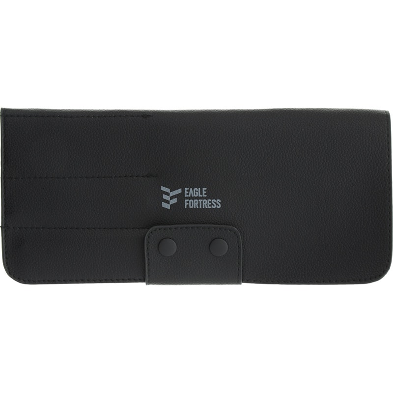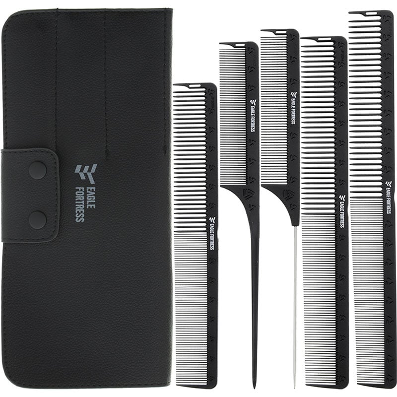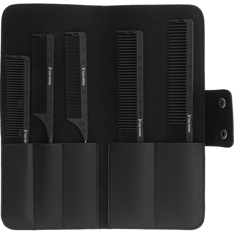 This comb set includes 5 comb pieces that fit into designated slots inside the pouch. Included are small, medium and large styling and cutting combs with dual teeth design, as well as tail and pin tail combs. The pouch is folded closed and secured with stud closures, making this ideal for travelling professionals.