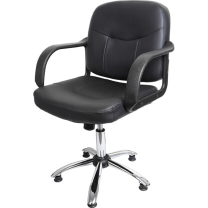 The salon styling chair remastered. A stylish, imported, affordable salon chair, fitted with black PU upholstery. Also features gas-lift for height adjustment, chromed base with sturdy legs, and extra stability as a result of the grippy pegs at its base. Fully adjustable tilting back-rest. Whole chair can also tilt back for versatile use and comfort.