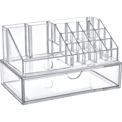 Cosmetic and beauty stand that assist in sorting and organising make-up, nail and beauty tools and products. The clear design with 22.5×12.5×13.8cm dimensions include a number of slots and spaces for versatile use. Clear design makes it easy to see contents.