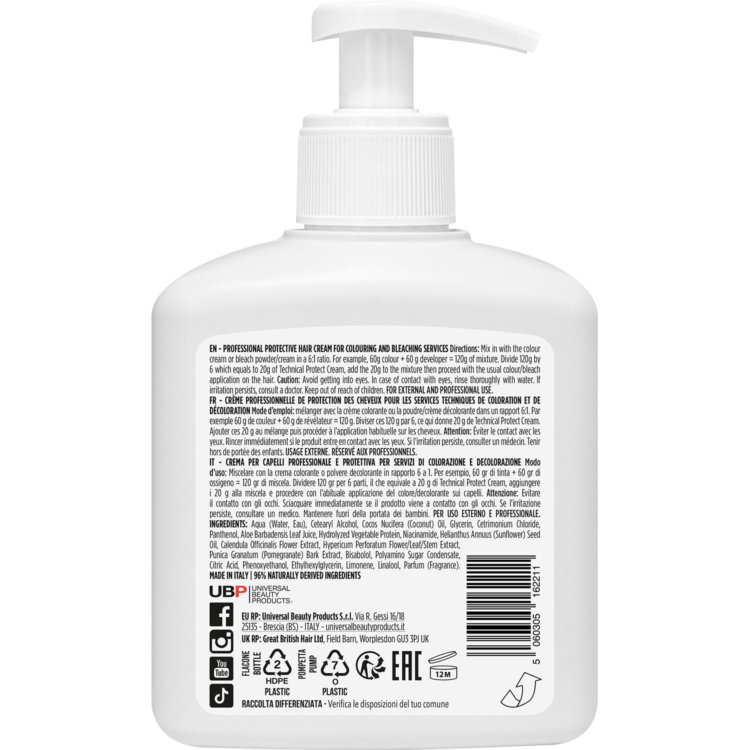 Directions: Mix in with colour cream or bleach powder/cream in a 6:1 ratio. For example, 60g colour + 60 g developer = 120g of mixture. Divide 120g by 6 which equals to 20g of Technical Protect Cream. Add the 20g to the mixture then proceed with the usual colour/bleach application on the hair.