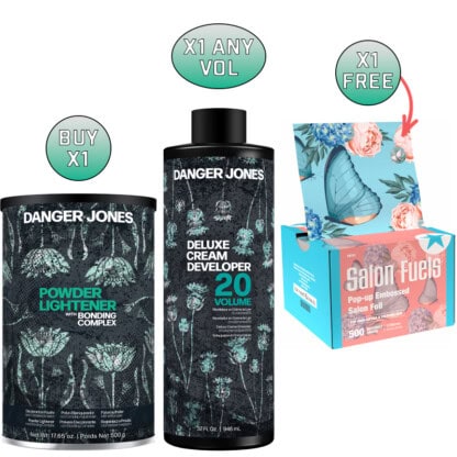 Buy a Danger Jones Powder Lightener with Bonding Complex, 500g and ANY VOLUME Danger Jones Deluxe Cream Developer, 946ml and receive Salon Fuels Pop Up Pre-Cut Embossed Coloured Foil, 500 Sheets FREE OF CHARGE.
