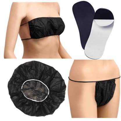 Disposable, black apparel kit for ladies contains all the necessary items needed for a hygienic spray tanning session. This pre-assembled kit includes a bouffant cap, one size bra, G-string and strapless sticky sandals that can be discarded after use.