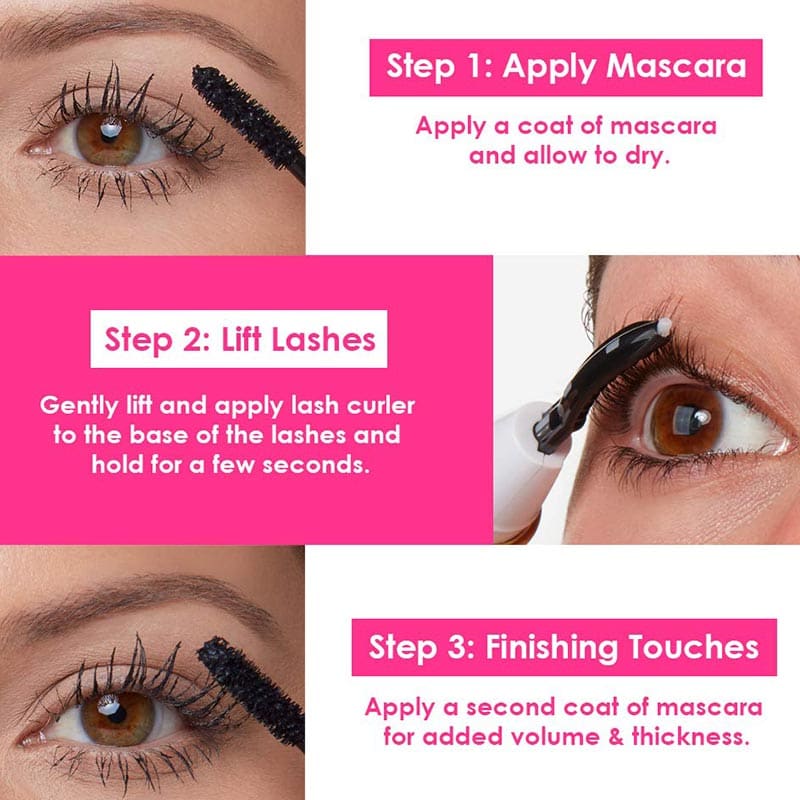 • Step 2: Heated curler may be used without mascara. To achieve a longer lasting curl effect, use with your mascara of choice. Apply mascara and immediately apply the heated curler to help mold lashes.
