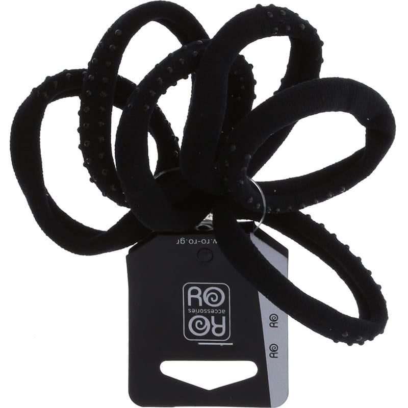 Ribbed hair elastics in solid black and adorned with strass for some extra dimension, perfect for holding hair in place. Ideal for creating ponytails. Plain black is ideal for concealing elastics in a style. Soft material and gentle elastic ensures a comfortable application, wear and removal. Textured material adds extra softness.