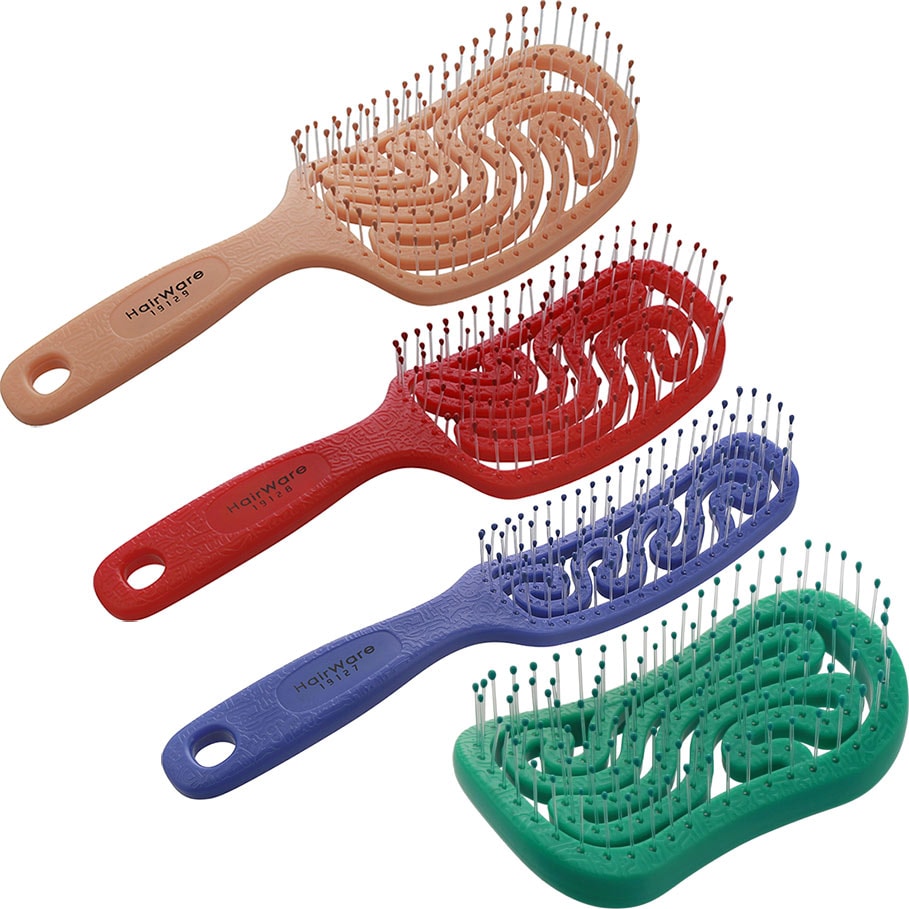 Immediately noticeable is this brush’s head. Following a swirl pattern, it is one of the most interesting brush shapes out there. The benefits of this shape are numerous. Firstly, the vents create unrivalled space for air to pass freely onto the hair. Hair will naturally dry faster as moisture is spread through styling. Please note that the bristles cannot withstand high heat, so use hot hairdryer air sparingly.