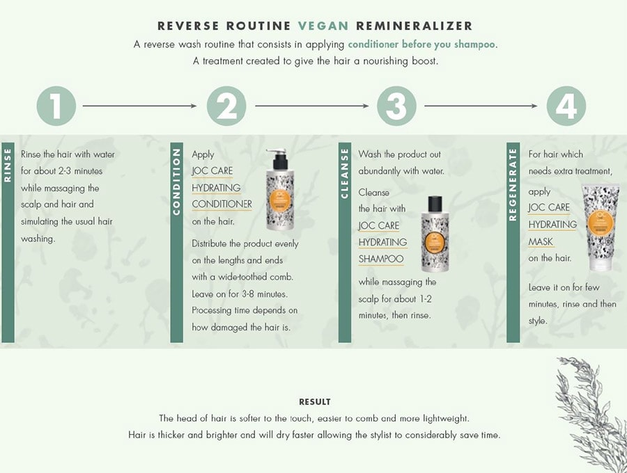 | STEP 3 | Rinse the conditioner out with plenty of water. Cleanse the hair with JOC Care Re-Hydra Hydrating Shampoo, while massaging the scalp for 1-2 minutes, then rinse. |