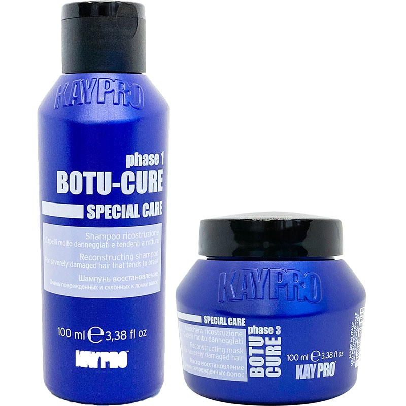 Travel set of the Botu-Cure range, featuring mini sizes of the shampoo and mask. This is a professional reconstruction regimen for an intensive emergency repair program to treat very damaged or compromised hair in danger of breaking.