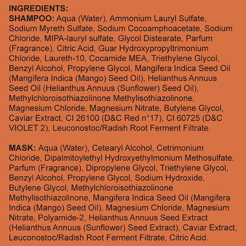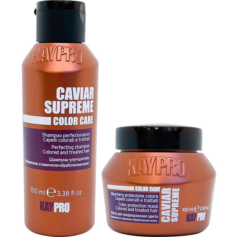 Travel set of the Caviar Supreme range, featuring mini sizes of the shampoo and mask. This is a regimen for intense colour enhancement by sealing in colour and preventing colour fade.