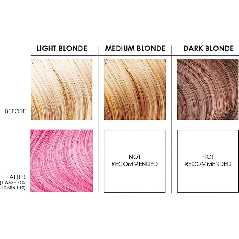 Light Pink is best used on hair that is a very light blonde or pre-lightened. Both Light Pink and Rose Gold are from the Pastel Collection, and have less direct dye pigments than many other colors. If you have virgin hair, try applying to dry hair. More consecutive washes or longer processing times may also be needed. If you have medium-blonde hair and still want pink tones, Hot Pink would be a better option.