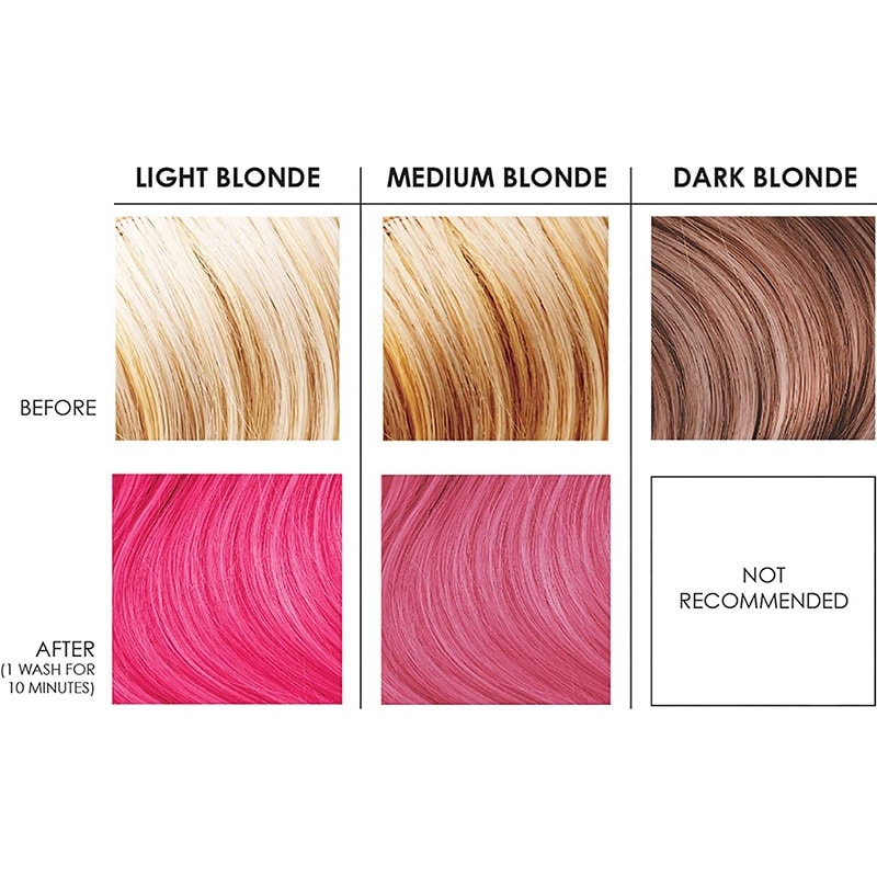 Light Pink is best used on hair that is a very light blonde or pre-lightened. Both Light Pink and Rose Gold are from the Pastel Collection, and have less direct dye pigments than many other colors. If you have virgin hair, try applying to dry hair. More consecutive washes or longer processing times may also be needed. If you have medium-blonde hair and still want pink tones, Hot Pink would be a better option.