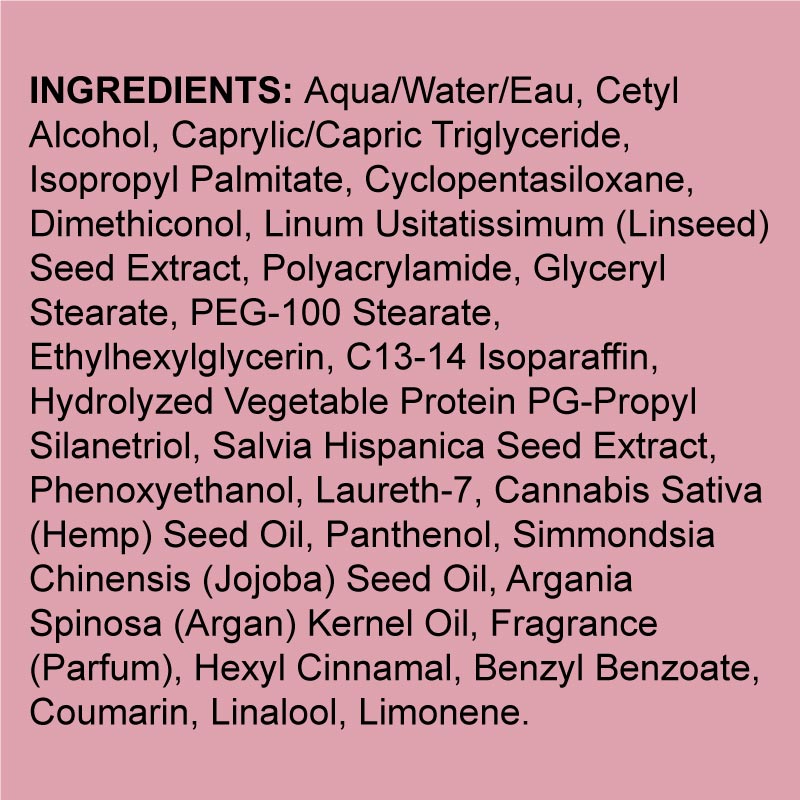 • Argan and Hemp Seed Oils smooth and detangle unruly hair, adding frizz and humidity control