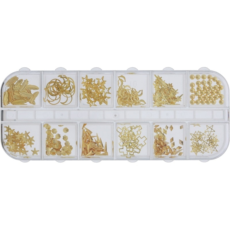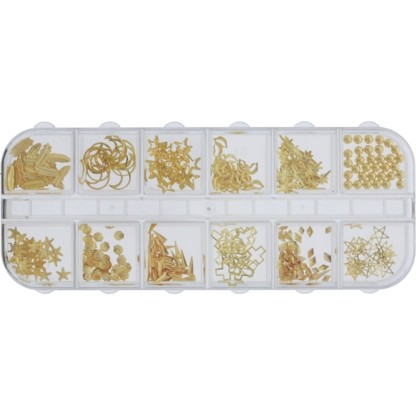 Box of nail decorations for adding height, texture, colour and fun to any nail style. Contains 12 grids, with 20 decoration pieces per grid. Features a number of different styles and shapes, including leaves, crescent moons, stars, bead pearls, diamonds and shells.