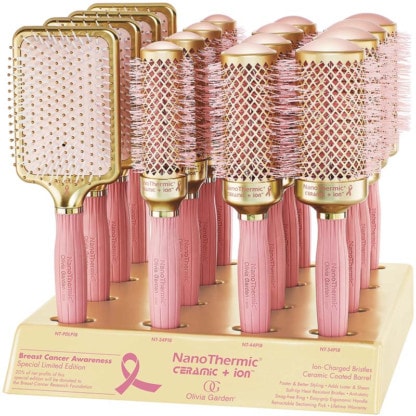Olivia Garden NanoThermic Ceramic & Ion Breast Cancer Awareness Gold & Pink Brush Display: 16 Brushes & Stand