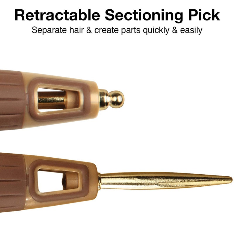 Snag-free ring. Easy-grip ergonomic handle. Lightweight for effortless styling. Retractable sectioning pick.