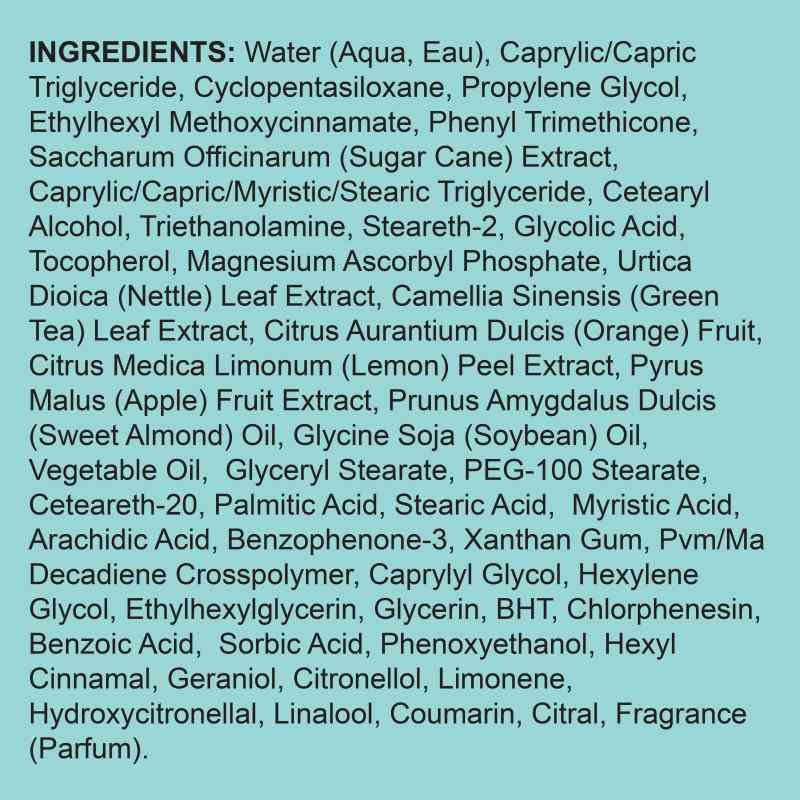 Glycolic Acid (AHA) is a natural exfoliant sweeps away dead skin cells. Magnesium Ascorbyl Phosphate (Stabilized Vitamin C) diminishes uneven pigmentation and improves skin elasticity. Tocopherol (Vitamin E) works with Vitamin C so skin looks refreshed and renewed. Retinyl Palmitate (Vitamin A) improves the appearance of skin elasticity.