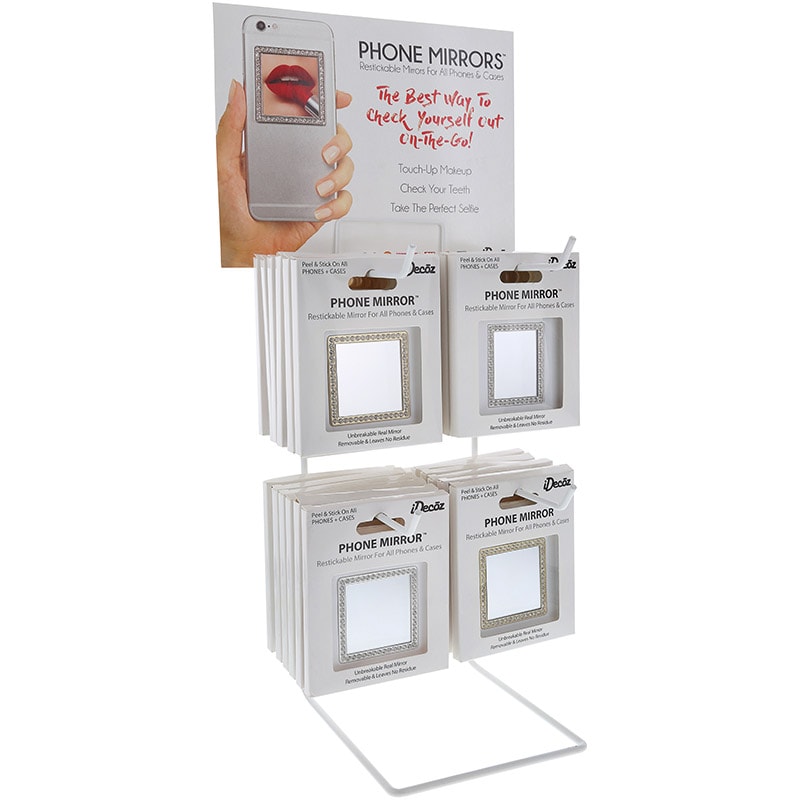 Restickable, unbreakable, real mirror that fits all phone and case varieties. Easy to attach and remove with no residue. Ideal for quick make-up touch-ups without the inconvenience of carrying a separate mirror. Coloured crystal border adds flare, uniqueness and style to all phone types.