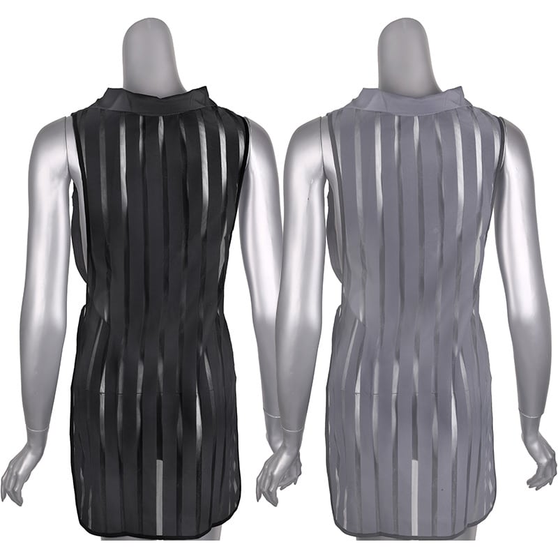 Features collar design and pockets for easy access to tools. Back of pinafore features striped, transparent design that will suit any trendy salon.