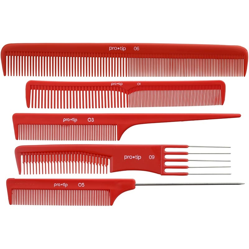 Comb collection featuring five combs for any styling situation. Completed with tool wallet for travel as well as easy access and storage. Professional quality for demanding styles. Ideal for any styling enthusiast.