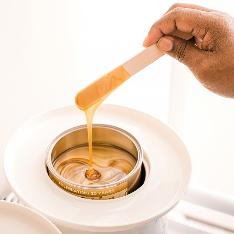 Apply talcum powder to lift the hairs. Test the temperature of the Film Wax on your inner arm using a wooden spatula.
