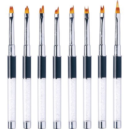 The ultimate nail art brush set kit for any enthusiast. A variety of same-sized brushes with unique bristle designs to achieve any design you want. These unique bristles allow you to easily reach any area on the nail surface with incredible precision. Each brush handle features grip area for maximum control.