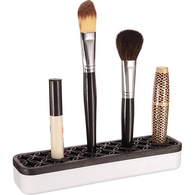 Make-up brush and tool holder with flexible silicone slots. Securely houses brushes and tools, maintaining their structure and hygiene when not in use. Flexible silicone slots can accommodate various brush and tool sizes and shapes to keep them safe and secure. Grippy silicone material ensures the brush or tool stands straight.