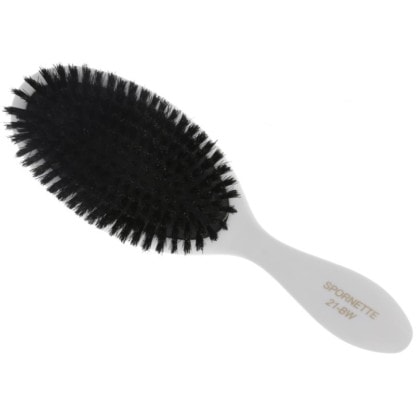 Spornette classic cushion boar bristle styling brush features 100% boar bristles. The bristles are nylon-free, so the boar bristles can easily hold the hair for styling, brushing out and creating finished looks. The porosity of boar bristles allow the bristles to brush out dead hair strands and distributes natural oils throughout the scalp. Pure boar bristle brushes also help close hair cuticles, so hair is left looking shiny and smooth.