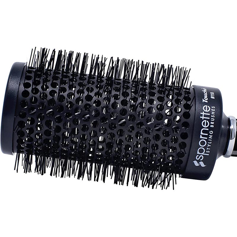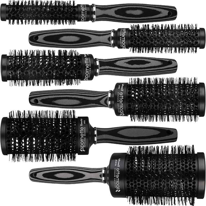 Spornette Touché round brush. One of our most popular and extensive collection, featuring both boar & aluminium nylon bristle, you’re sure to find the styling tool you need. The aluminium barrel aerated rounders were one of the first on the market. The round brushes each have a soft foam handle so you or a professional stylist can use for extended lengths of time.