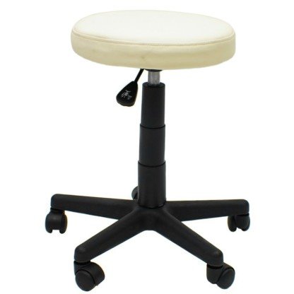 Vinyl upholstery with gas-lift for height adjustment, chromed base, on wheels. Classic stool design.