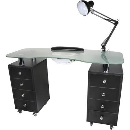 Glass top manicure table. Large amount of space available with 2 cupboards featuring 4 drawers on each side. Features lamp and dust/fume extractor with arm rest. Table on wheels for easy maneuverability. An all-in-one manicure table for professional nail services.