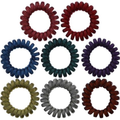 Telephone cord hair elastic that stretches and folds very easily for ponytails and other styles. Glimmering, coloured design to add flair and elegance to styles on special occasions or normal day-to-day activities. Easy and quick to put on and remove and is comfortable to wear over long periods. Does not leave imprint on hair and does not catch or snag as it is applied or removed.