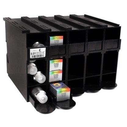 Tint storage container with space to hold 25 tubes of tint outside their packaging. A modular design where multiple containers can be stacked on top of each other to increase your maximum holding capacity. Ideal for organizing tints according to their level, making it much easier to locate and grab the tint you need during services. Tint not included.