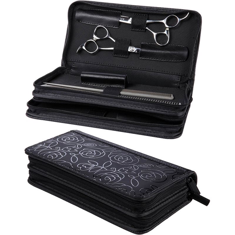 Soft, textured exterior with cushioned structure to protect valuable tools and implements within. Features specialised compartments to fit shears, razors, combs and other similarly-shaped tools. Small and compact for easy travel.