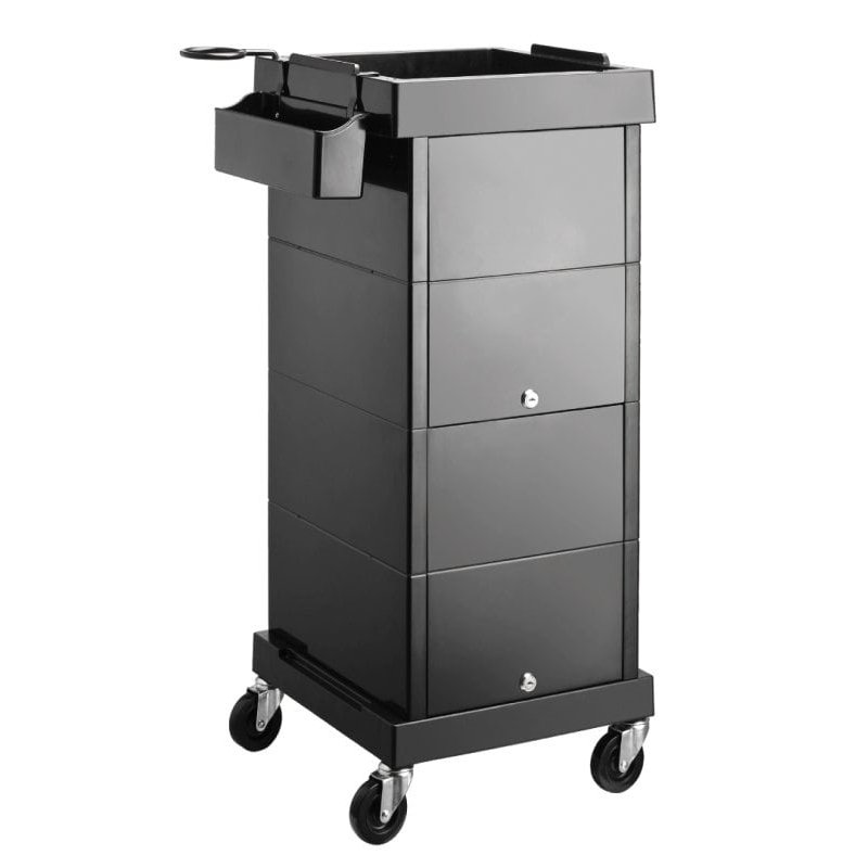 Trolley with 4 drawers, two of which are lockable for safekeeping. Features hair dryer holder attachment, and side compartment. Classic, minimalist, black design. Easy to move around salon area with fitted wheels.