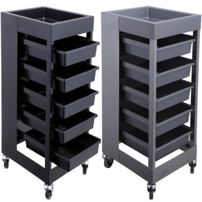 The trolley for those that need maximum space. Features 5 removable drawers with lots of space for equipment and tools. Ample maneuverability with wheels. Ideal for any stylist or hairdresser that needs access to lots of tools and product for different services. Easy to move around salon area.