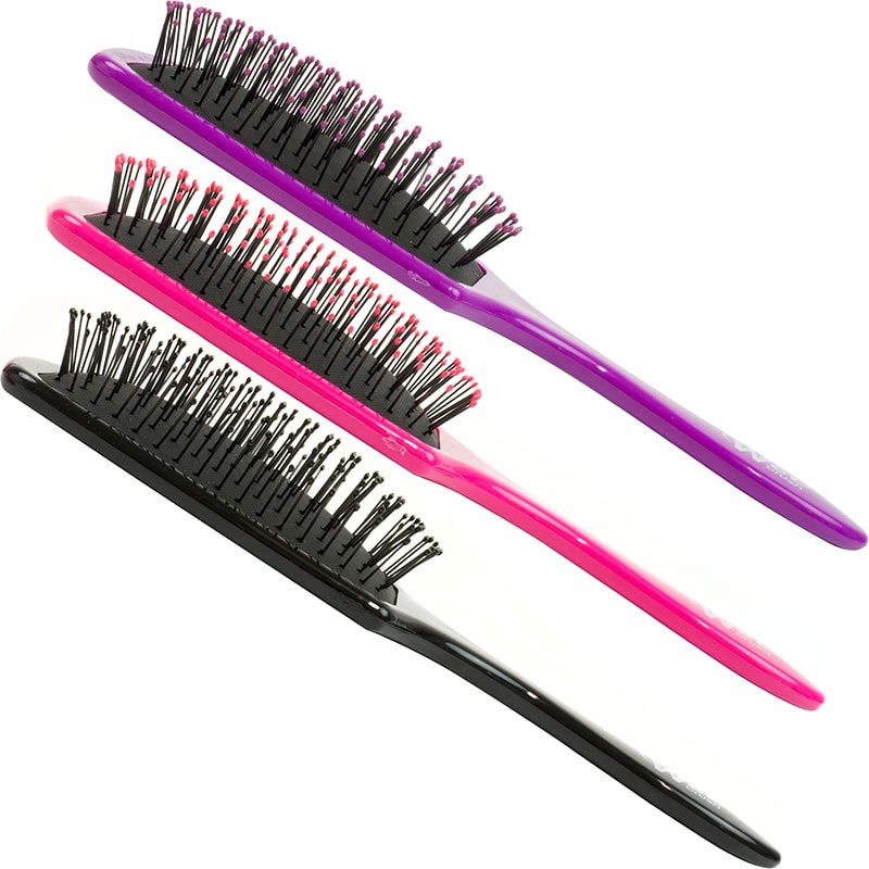 Features SofTips™, twice-dipped, ultra-soft ends that are guaranteed not to fall off. Ensures ends are soft, full and permanent. Extremely gentle, ideal for sensitive scalps. Located at the very top of the bristles, they massage the scalp to stimulate circulation at the follicle. They are firm enough to comb through knots, yet flexible enough to be gentle on the scalp. Can be used on wet or dry hair and works on extensions and wigs.